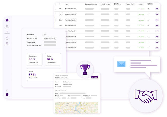 ProcurAgents est une plateforme en ligne qui vous permet d’organiser des appels d’offres pour vos marchés et qui facilite l’analyse des réponses des candidats.